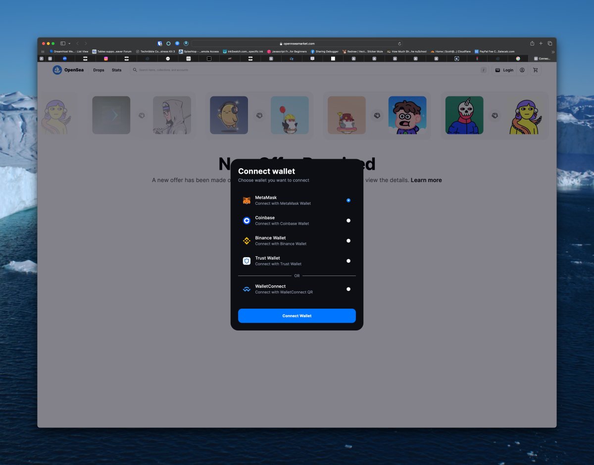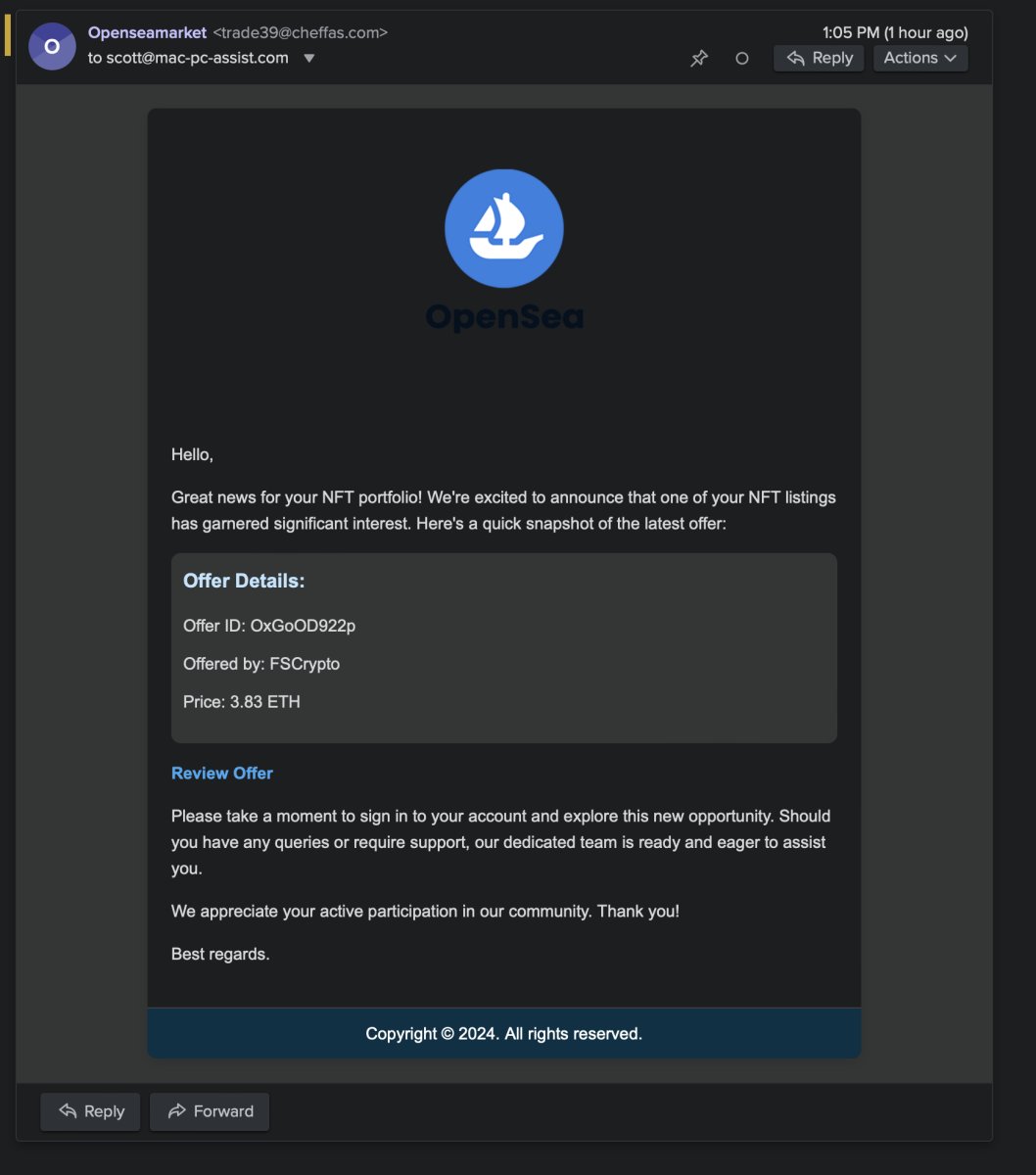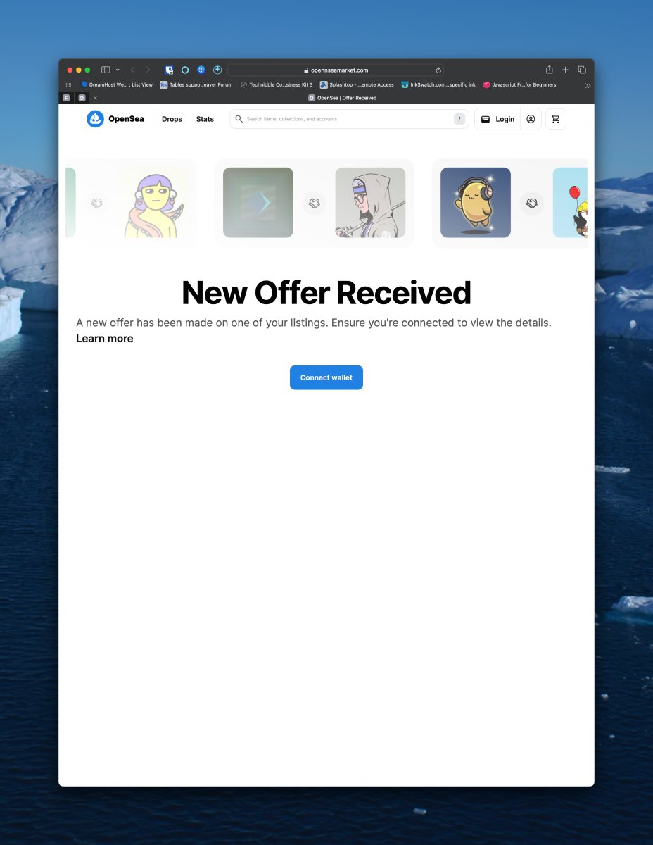 It opens to https://openseamarket.com that is pretending to be https://opensea.io, the real trading place for NFT and other alt-currency products.